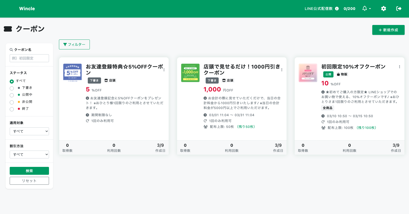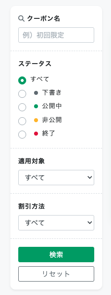 クーポン名やステータス、適応対象、割引方法による検索が簡単にできます。