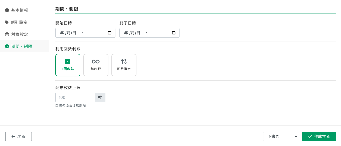 基本情報、割引設定、対象設定、期間・期限の詳細を入力