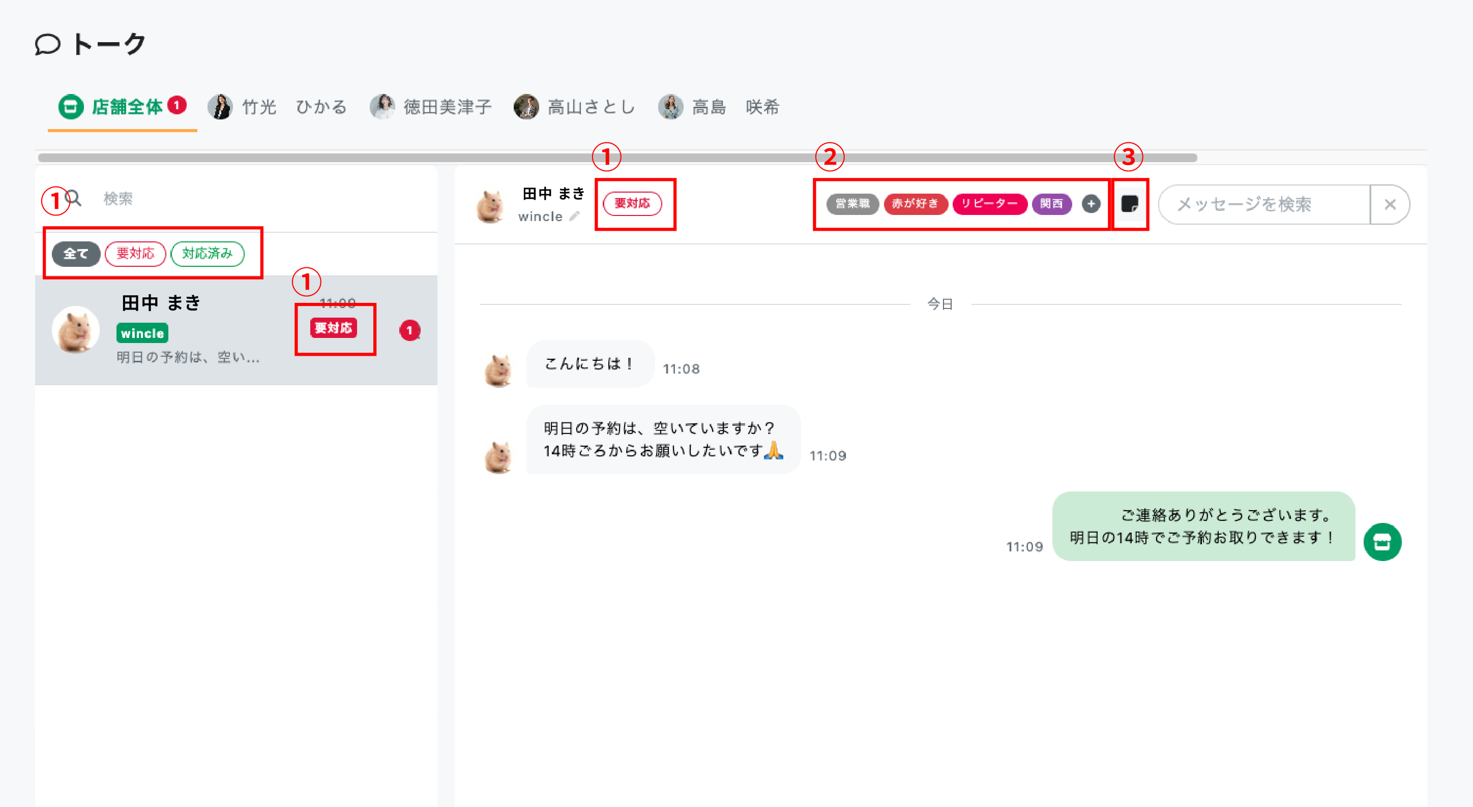 トーク画面の名前の右にあるステータスボタンをクリックすると、「要対応」「対応済み」のステータスを設定が可能です。トーク一覧画面にも反映されます。