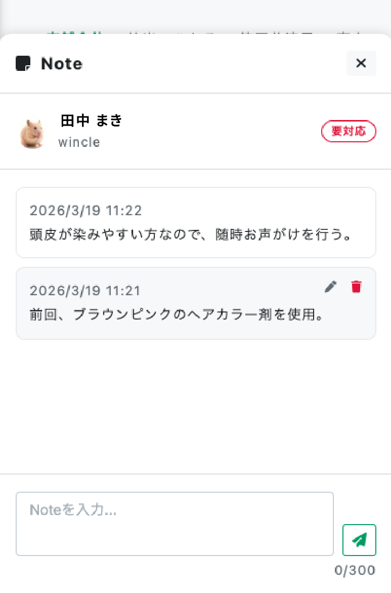 各トークごとに顧客専用のノートを追加できる機能です。対応履歴や好み、注意点などをメモとして残すことで、顧客情報を一元管理できます。