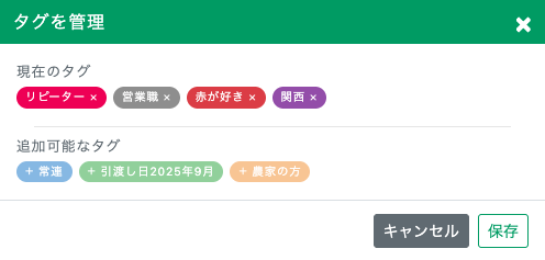 「追加可能なタグ」に表示されているタグをクリックすると新しくタグを追加でき、「現在のタグ」に表示されているタグの×(バツ)ボタンをクリックすると、タグが解除されます。