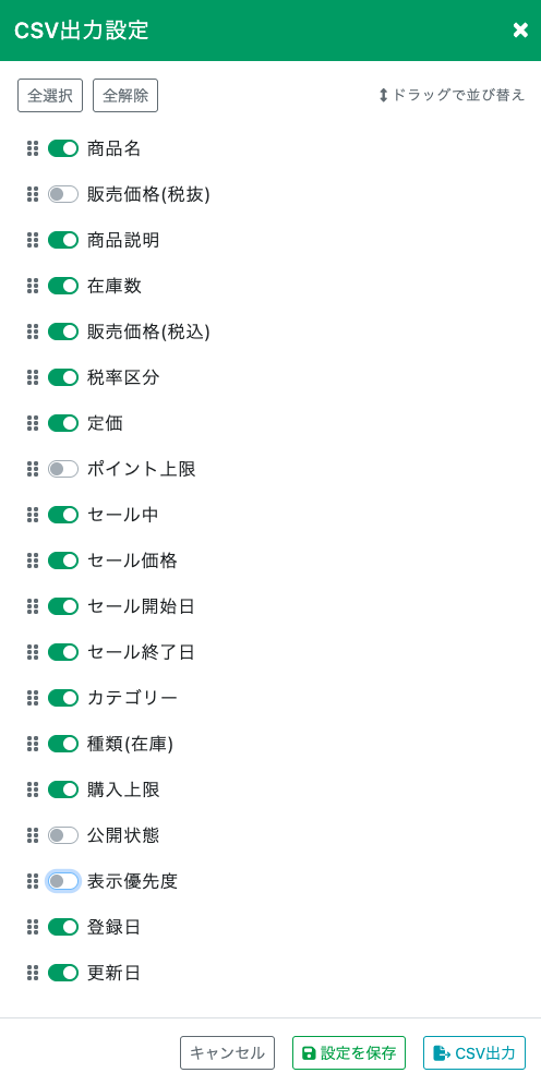 ・出力する列をドラッグ&ドロップで自由に選択・並べ替えが可能